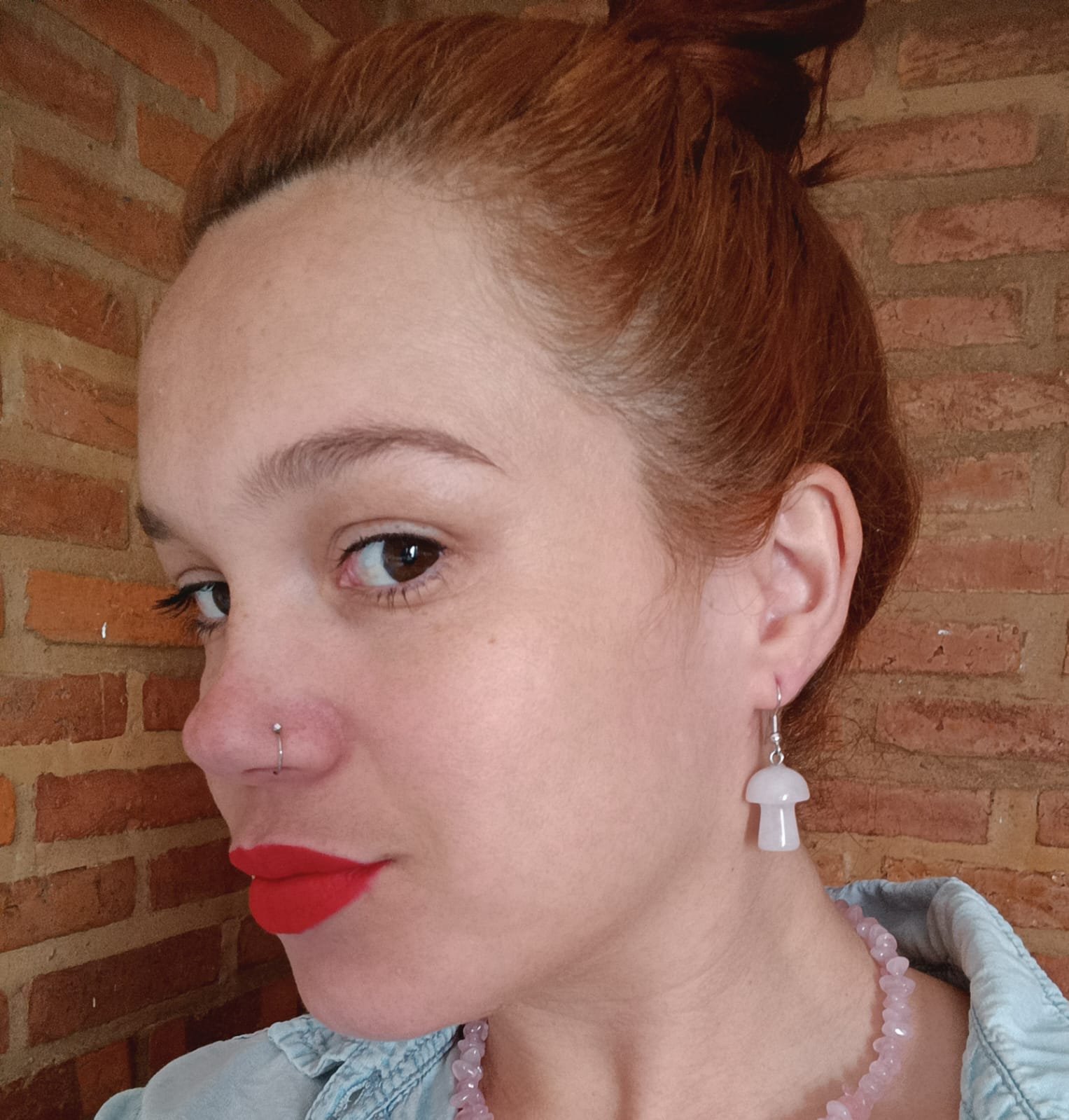 Brinco com gancho de metal, adornado com pedra natural de quartzo rosa, polida em formato de cogumelo. A pedra mede cerca de 2 cm.
